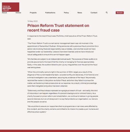 This wasn’t a small amount, it was over £300,000. The organisation – Prison Reform Trust (PRT). They had appointed an individual with a previous fraud conviction for a senior role involving financial responsibility. Little by little right under the nose of the board of trustees, with the then Chairman who is now the Minister of State for Prisons, Probation and Reducing Reoffending. The current CEO, the former Head of Women’s prison estate was quick to say: “We would like to assure our supporters that no programmes or services were affected by this incident, and the charity remains committed to its mission to create a just, humane and effective prison system”.