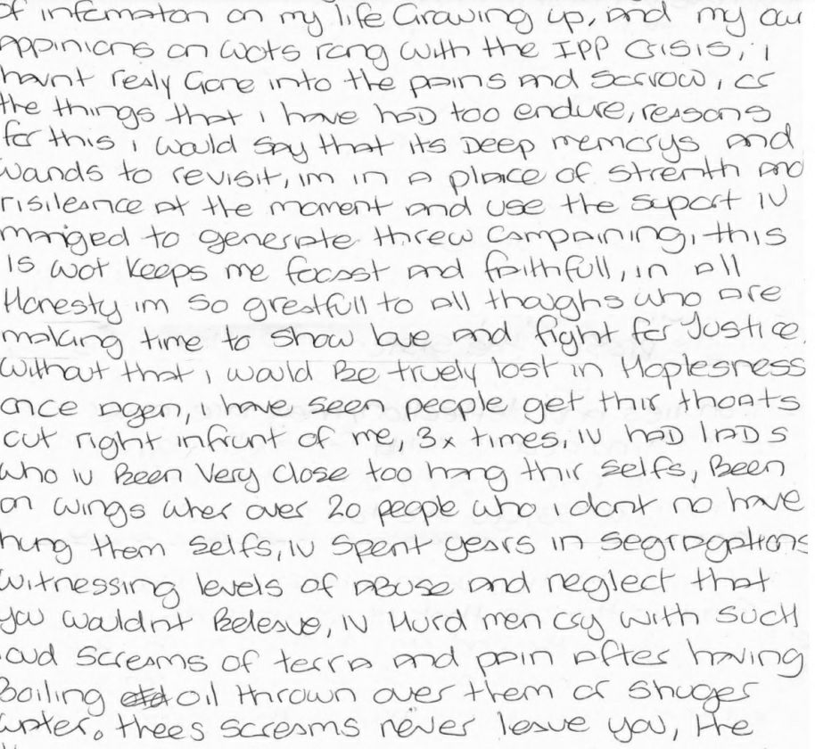 I feel like even though I have given you a lot of information on my life growing up and my opinions on what’s wrong with the IPP crisis, I haven’t really gone into the pains and sorrows of the things that I’ve had to endure. Reasons for this, I would say that it’s deep memories and wounds to revisit. I’m in a place of strength and resilience at the moment and use the support I’ve managed to generate through campaigning. This is what keeps me focused and faithful.